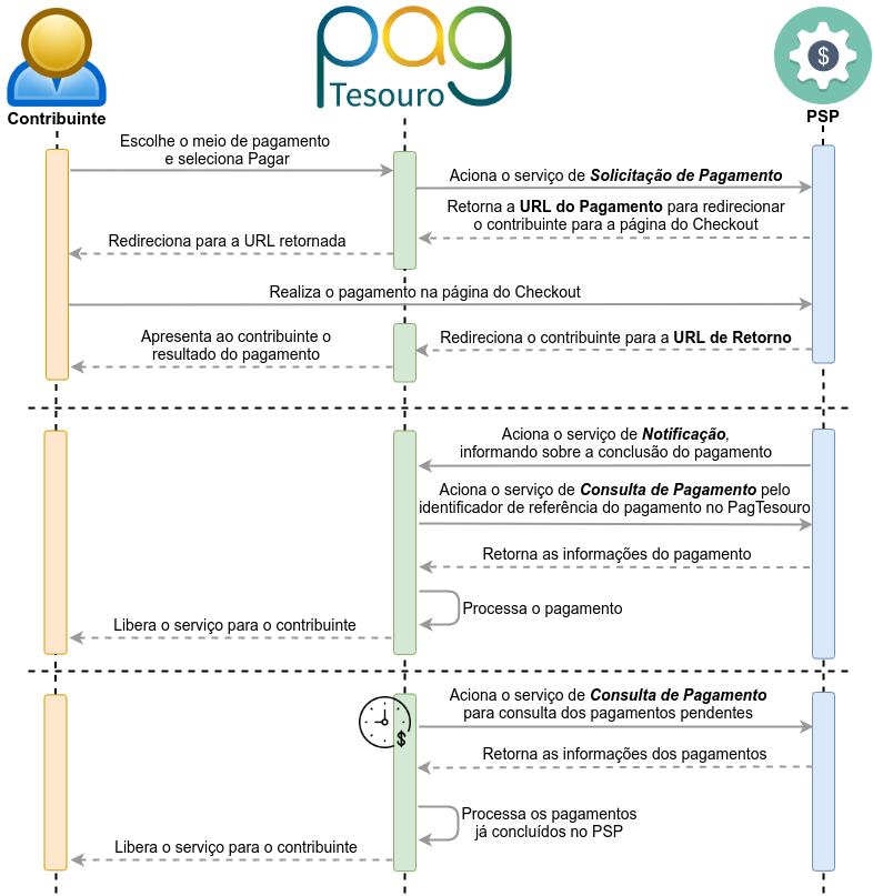 Internamente o PagTesouro fará o mapeamento da situação retornada pelo PSP, conforme configuração prévia, para uma das três situações previstas no PagTesouro.